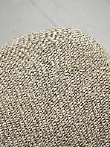 Pair of teak chairs with curved half-moon backrest, beige reupholstered seat and visible joint details.