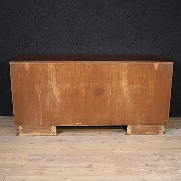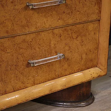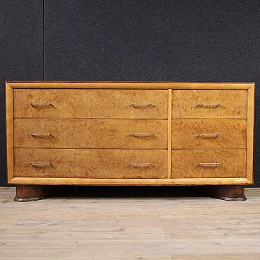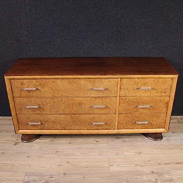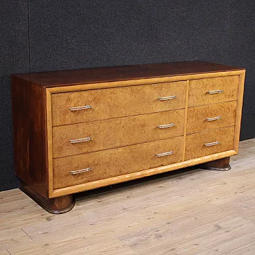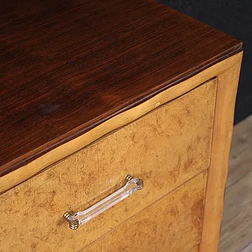 Wooden upper surface in character of excellent size and service. The contrast between the rosewood and the lighter woods of the front of the cabinet is very captivating. Drawers adorned with slightly wavy wooden frames (see photo). Chest of drawers resting on two solid moving legs of excellent solidity and stability. Structurally sound and solid, it shows some signs of aging (see photo). In good condition, needs polishing.