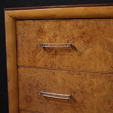 Italian designer chest of drawers from the 70s. Furniture with beautiful lines and pleasant furnishings carved and veneered in rosewood, briar and fruit wood. Chest of drawers equipped with 6 spacious drawers, 3 plus 3, adorned with plexiglass and golden brass handles. Furniture built in a single non-divisible block, only the drawers are extractable to facilitate movement and insertion into the home.