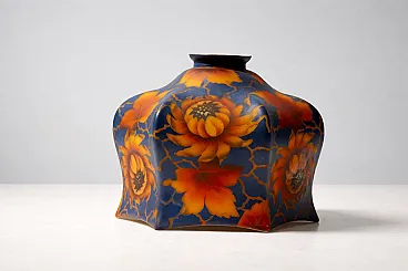 The shade is made entirely of glass and decorated with layered painted motifs. When illuminated, the surface allows light to pass through the decoration, creating a warm and diffused lighting effect.