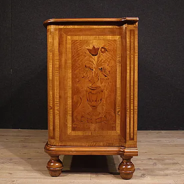 Italian chest of drawers from the second half of the 20th century. Furniture finely inlaid in various precious essences including walnut, cherry, maple, bois de rose and fruit wood with very pleasant floral decorations. Dresser with three drawers of excellent capacity supported by four solid onion feet.
