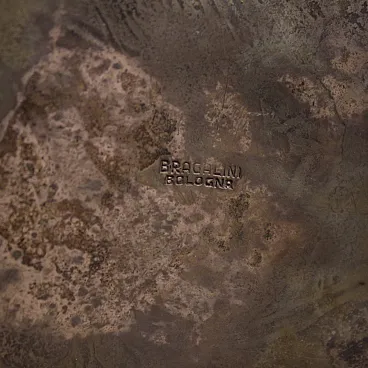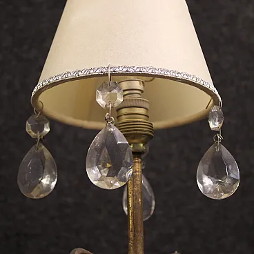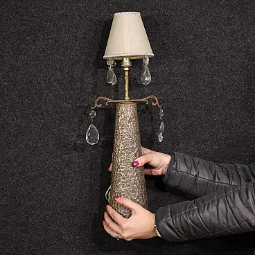 Italian lamp from the mid-20th century. Brutalist style worked metal object stamped under the base Bragalini Bologna (see photo) referable to the designer Angelo Bragalini (1913-1994), missing additional documentation. Single light table lamp adorned with teardrop glass and small lampshade.