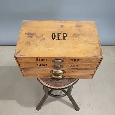 Authentic industrial wooden filing cabinet featuring four drawers with original brass cup handles. The upper drawers retain black stenciled inscriptions reading “Start” and “O.E.P.”, enhancing its period industrial character.