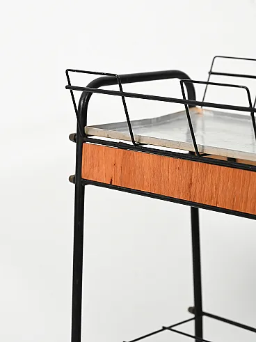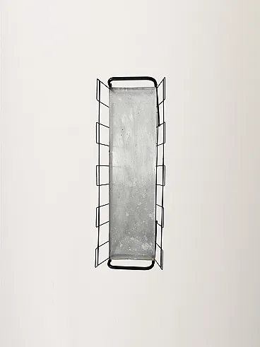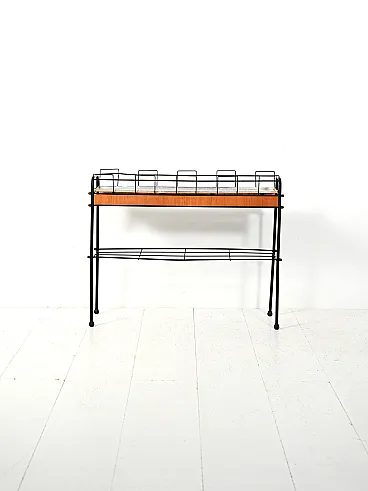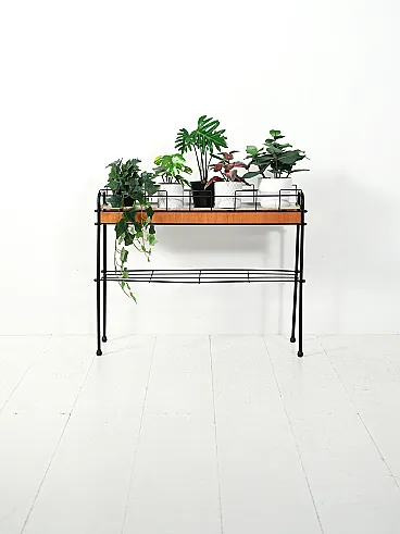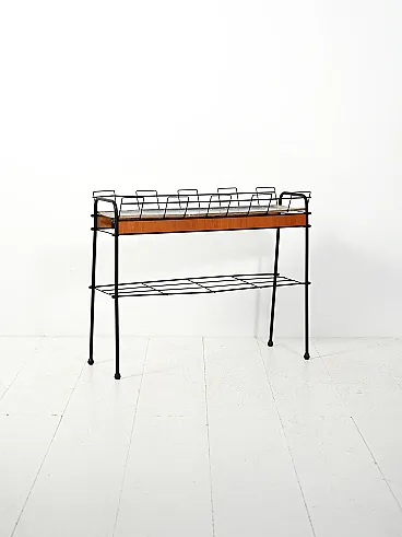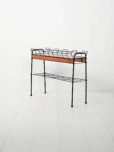 Scandinavian flower holder from the 60s-70s characterized by a slender structure in black lacquered metal, combined with teak inserts that warm up its appearance. The composition is defined by geometric lines and light proportions, with a lower shelf that reinforces the practical function of the whole. The removable internal steel plate is designed to collect water discreetly. A typical object of Nordic domestic culture, where functionality and formal rigor coexist with essential elegance.