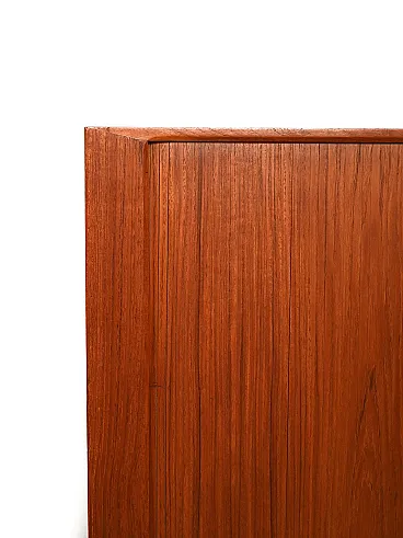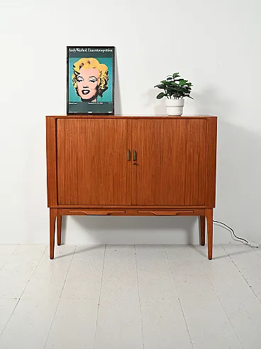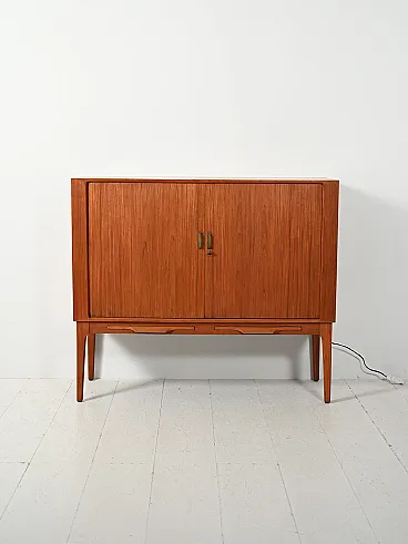 Rare Scandinavian bar cabinet from the 1960s attributed to Kurt Østervig, central figure of Danish modernism, known for an elegant and measured design, always oriented towards construction quality and functionality. The piece of furniture is veneered in teak, with warm and regular grain, and rests on tapered legs which visually lighten the volume.