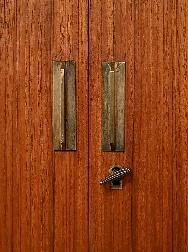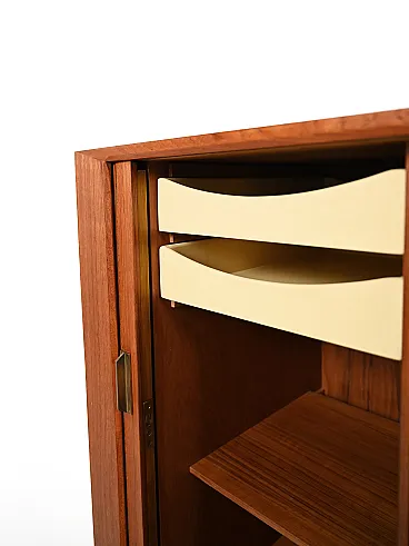 Rare Scandinavian bar cabinet from the 1960s, attributed to Kurt Østervig, teak veneer with refined internal organization and brass details.