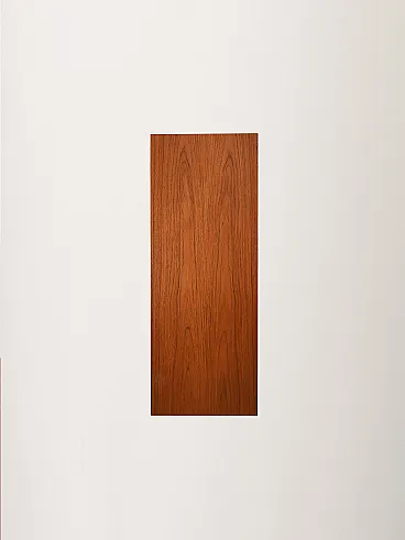 The characteristic horizontal roller closure conceals an articulated and sophisticated interior: a section with mirrored walls and a worked glass shelf, designed to enhance bottles and glasses, flanked by a compartment with small cutlery drawers and shelves for objects. There is an original and functioning lighting element. The brass handles introduce a delicate material contrast with the teak. Østervig, active mainly between the 1950s and 1960s, is appreciated for his ability to combine formal rigor and craftsmanship, making his furnishings particularly sought after by collectors.