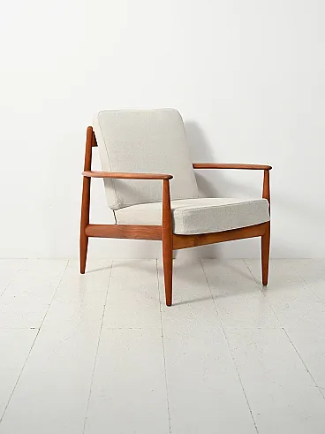 Iconic “118” model armchair designed by Grete Jalk for France & Daverkosen, Denmark, 1960s. The teak structure, with fluid and balanced lines, reflects the designer's approach, attentive to the dialogue between ergonomics and visual lightness. Grete Jalk, one of the few important female figures in post-war Danish design, collaborated with France & Daverkosen to define furnishings intended for high-quality production, always recognizable for their elegance and formal rigor. The seat and backrest retain the original structure; the cushions were redone and reupholstered in a very light beige fabric, respectful of the character of the time.