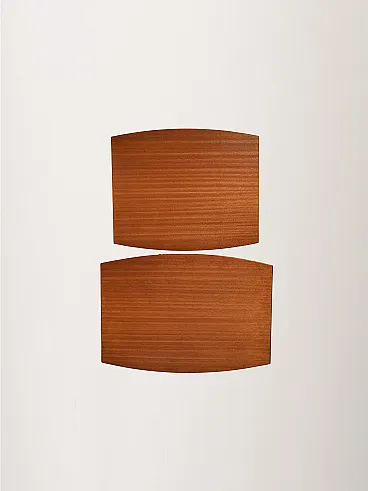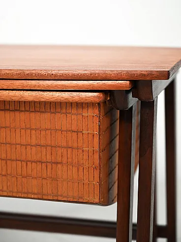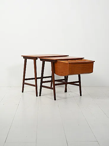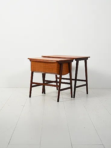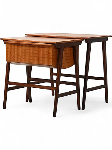 Scandinavian set from the 1950s composed of two interlocking coffee tables, played on the contrast between the dark lacquered oak structure and mahogany tops. One of the tables integrates a wool container with drawer and compartments: the basket is made with thin wooden slats sewn together, a process halfway between cabinet-making and weaving.