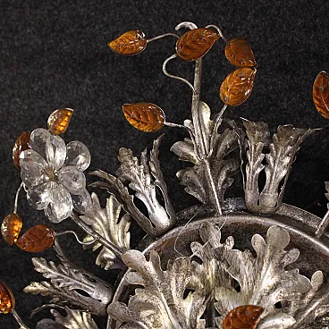 Large Florentine ceiling light from the 1970s. Object produced by Banci Firenze in silver metal with floral decorations in colored and transparent glass. 9-light wall lamp with strong visual impact and great elegance, for antique dealers and interior designers. Electrical system to be checked for perfect operation.
