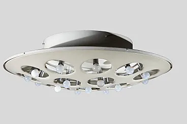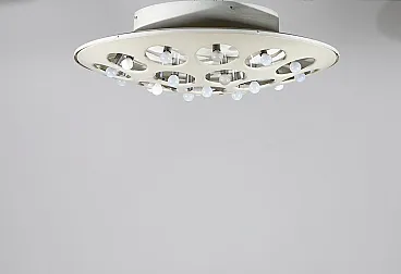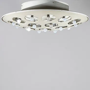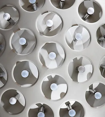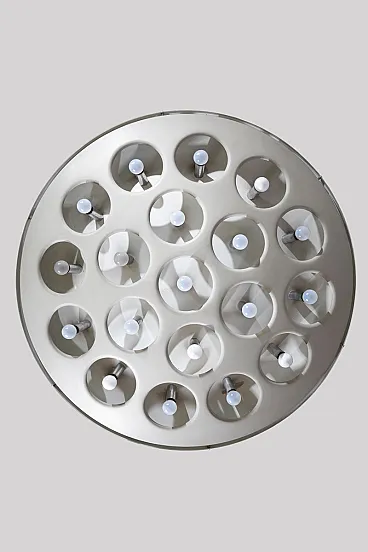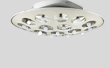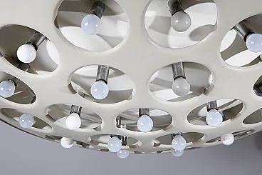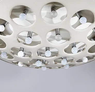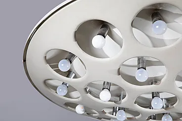 A rare and monumental Model CP3529 chandelier, designed and produced by the prestigious Italian lighting firm Stilnovo during the 1960s. This striking suspension lamp is a masterclass in Italian mid-century modernism, featuring a grand, disc-shaped body in white lacquered aluminum characterized by its iconic series of circular apertures. The CP3529 is highly sought after for its sophisticated interplay of light. The perforated aluminum structure houses a multi-bulb system that projects a brilliant, diffused glow both downwards and through the circular cut-outs, creating a captivating visual rhythm on the surrounding surfaces. The contrast between the clean, matte white finish of the shell and the polished chrome accents of the sockets exemplifies the high-end industrial craftsmanship for which Stilnovo's Milanese workshops were renowned. As a suspended chandelier, this piece commands attention and defines the volume of any room. Its expansive scale and streamlined silhouette make it a perfect centerpiece for grand dining rooms, mid-century modern living areas, or high-ceilinged galleries.