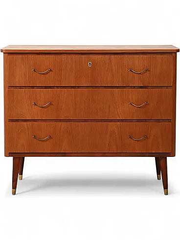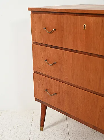 1950s-60s chest of drawers in teak with mahogany inserts, slender legs with brass tips and deco-style metal handles. Scandinavian chest of drawers from the 1950s-60s made of teak with elegant mahogany details that enrich the surface. The front is punctuated by three large drawers with metal handles with a deco feel, while the tapered legs are embellished with brass tips. Balanced proportions and clean lines reflect the Nordic aesthetic of the period. Good condition. It may show some signs of aging.