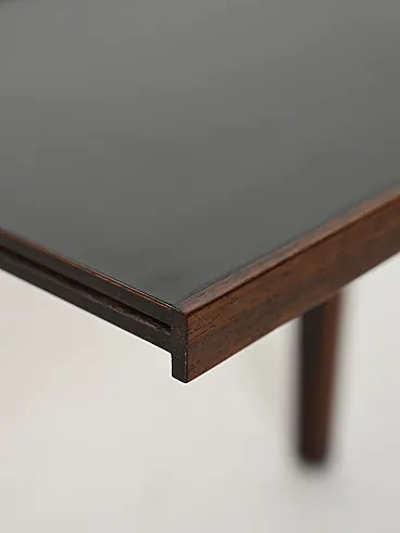 Coffee table designed by Severin Hansen for Haslev Møbelsnedkeri, a refined expression of 1960s Danish modernism. Hansen, known for the precision of proportions and the balance between geometric rigor and material warmth, collaborated for a long time with Haslev, creating high quality furnishings. The rosewood, with deep and symmetrical grain, is enhanced by clean joints and impeccable construction details.