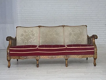 1930s, Danish 3-seater sofa. Original red furniture velour, handcarved ash wood, furniture mesh, brass springs in the seat. Original good condition with patina: no smells, no stains and stable construction. Manufactured by Danish furniture maker in about 1930-35s. Original Scandinavian vintage design directly from Denmark. The sofa was checked by craftsman.