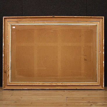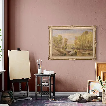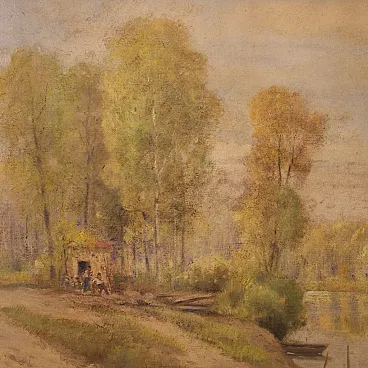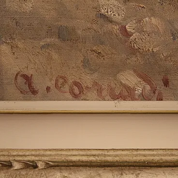 Italian painting from the mid-20th century. Oil on masonite work depicting a countryside view, river landscape with boats and characters of good pictorial quality. Painting adorned with a beautifully decorated lacquered and gilded (bronze colored) wooden frame. Work signed A. Corradi on the bottom left (see photo) referable to the painter Alfonso Corradi (1889-1972) lacking authentication. Painting of pleasant depth, ideal for placing in a living room or living room, for antique dealers and interior designers. The painter is good at creating the mirror on the river that reflects the boats, the sky and the trees (see photo). Work in good condition and beautiful patina, with some small signs of aging. Painting light H 78 x W 118 cm.