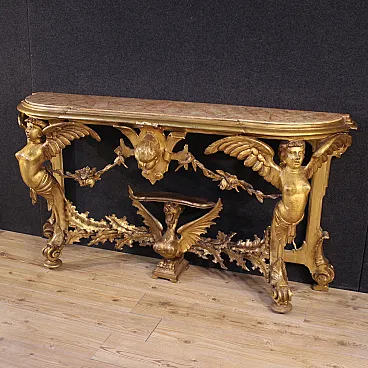 Italian console from the early 20th century. Furniture in finely gilded and carved wood with anthropomorphic and zoomorphic figures and floral decorations in antique style of great quality. Living room console equipped with a non-original wooden top, replaced over time, faux marble lacquered, of good size and service. Side uprights adorned with large winged cherubs. In the center we find the face of a putto in relief and in the lower part, at the junction of the legs, a large figure of a winged dragon. Cabinet that housed a built-in mirror in the back (see photo) now missing. Console supported by four solid legs, onion-shaped front feet with upper curl decoration. High-impact piece of furniture, for antique dealers and interior designers, in a beautiful patina. Structurally sound, it has small drops in gilding and some signs of aging. Overall in good condition.