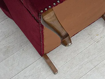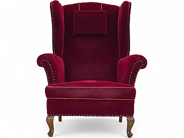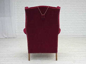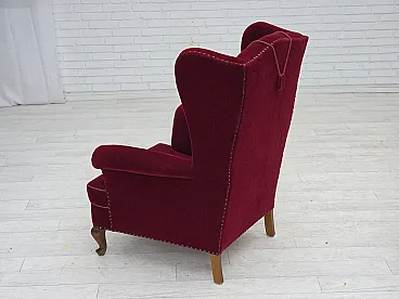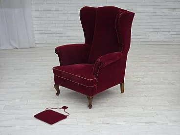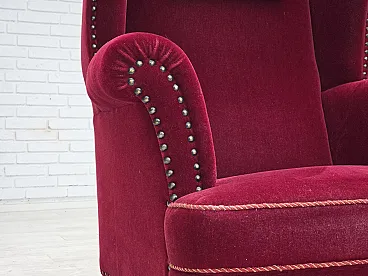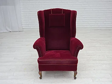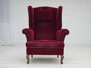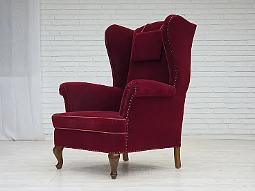 Danish highback wingback armchair, cherry-red velour, 1960s