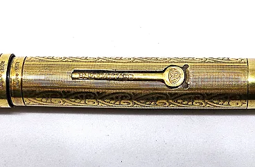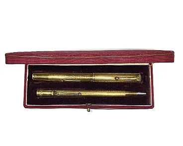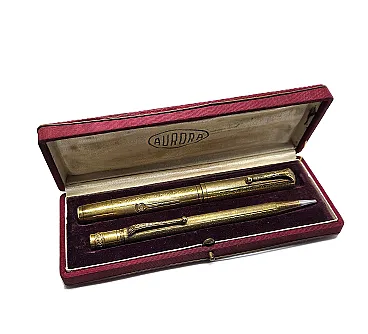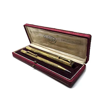 Complete Aurora set from the 1920s-1930s, consisting of lever fountain pen and coordinated mechanical pencil, 14KR gold plated, with original case. Elegant Turin production in Art Nouveau style, with guilloché decoration and perforated leaf motifs.