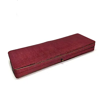 External covering in burgundy fabric with metal piping all over the edge. Cream satin interior with embossed Aurora logo, two dedicated compartments. Dim. 155x60x20 mm