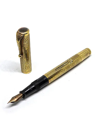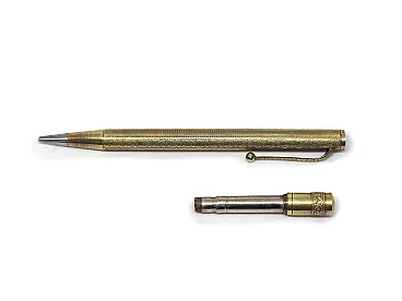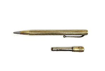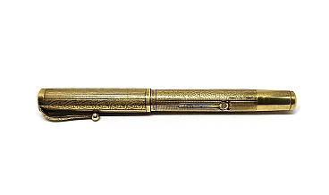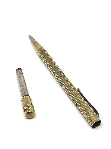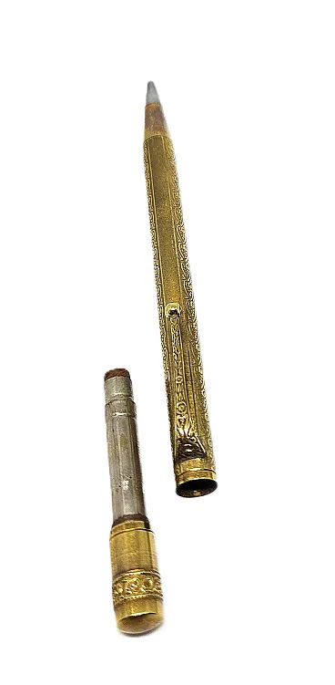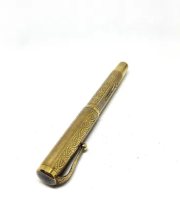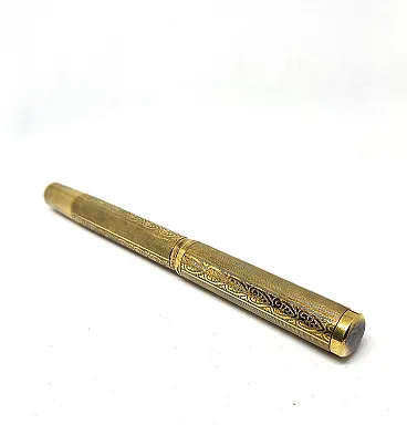 14KR gold plated metal, gold filled. Art Nouveau guilloche decoration. Ornamental clip. Chromed metal tip.
