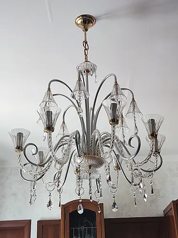 The structure features gold-plated metal details that enhance the brilliance of the glass and crystals, creating a dramatic effect typical of traditional Venetian chandeliers.