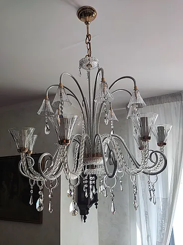 An elegant Venetian chandelier crafted from clear blown glass with refined intertwined arms and crystal pendants.