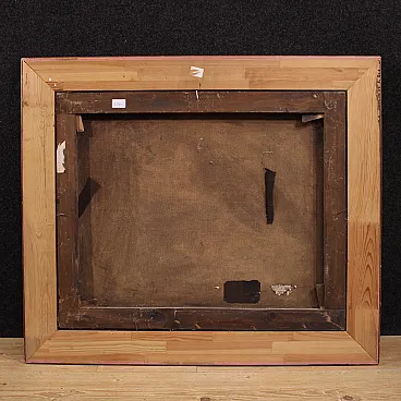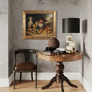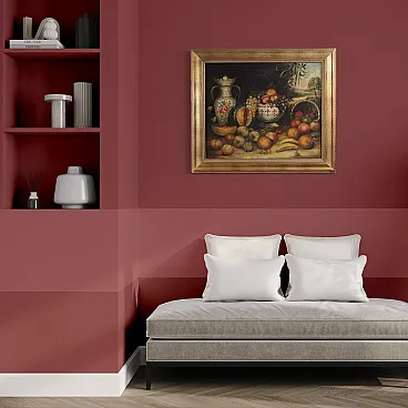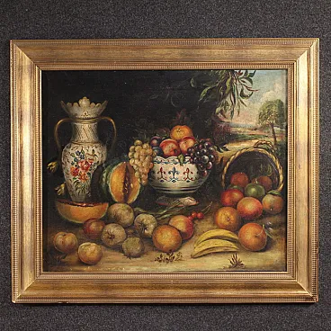 Spanish painting from the first half of the 20th century. Antique style oil painting on canvas depicting a still life with fruit and ceramics of good pictorial quality. Modern frame in wood and plaster, carved and gilded (bronze colour) with a beautiful decoration. Painting that develops horizontally, enriched by numerous details, with a landscape in perspective in the background. Rustic work ideal for placing in a kitchen or living room, for antique dealers and interior designers. The painting has undergone a conservative restoration with visible patches on the back of the canvas (see photo) and color recovery in some places. In good condition. Light painting H 59 x W 71.5 cm.