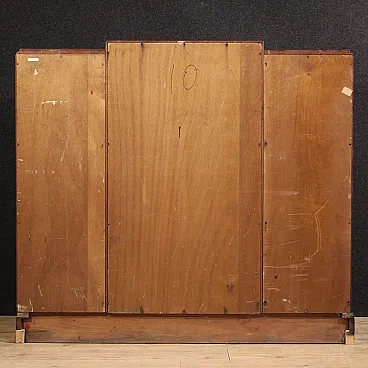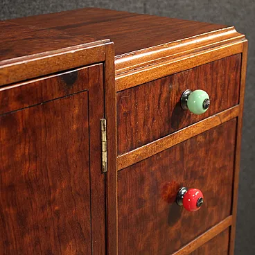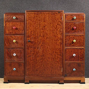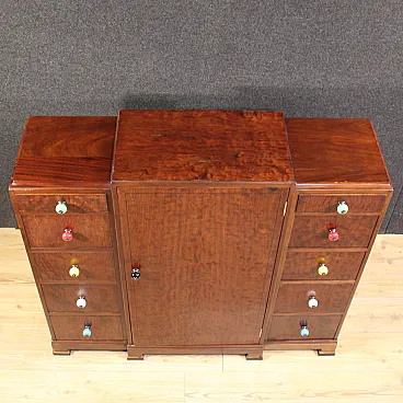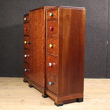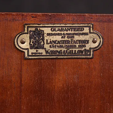 English chest of drawers from the first half of the 20th century. Art Deco period furniture carved, veneered and inlaid in flamed walnut, mahogany and ebonized wood. Inside the door there is a metal plate which contains information on the manufacturer and creator Waring & Gillow Ltd, a famous English luxury furniture company. Chest of drawers equipped with 10 external drawers adorned with non-original colored knobs, replaced during the restoration. Furniture also equipped with a large central door which offers several shelves inside, of good capacity and service. Chest of drawers with beautiful lines and proportions, easily inserted in different parts of the house, for antique dealers and interior designers. Base cabinet, of excellent stability and solidity, in good state of conservation with some small signs of wear.