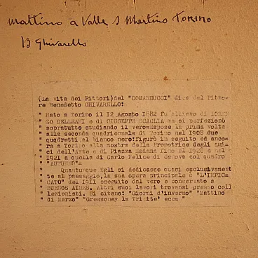 Italian painting from the first half of the 20th century. Oil work on cardboard depicting a bright countryside landscape with a traveller, of excellent pictorial quality. On the back we find indications on the Turin location of the foreshortening and on the painter Benedetto Ghivarello (1882-1955), a work without authenticity. Painting signed on the front bottom right (see photo).