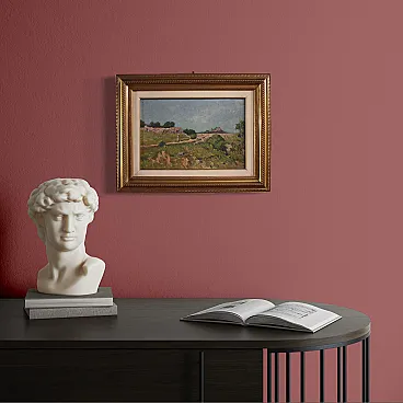 Landscape characterized by bright colors adorned with a finely crafted and gilded wooden and plaster frame (see photo). Small in size, easily placed in different parts of the house, for antique dealers and collectors. In good condition. Light painting H 21.5 x W 31.5 cm.