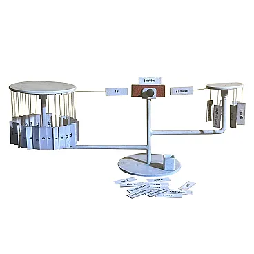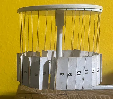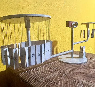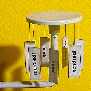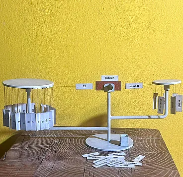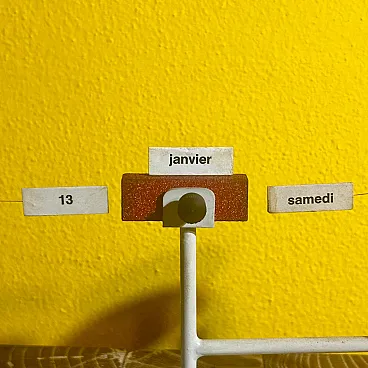 Designed in the late 1950s, this perpetual calendar translates time into a small mechanical landscape: suspended wires, magnets and tags become elements of a poetic micro-architecture, typical of the best postwar Italian design. An object that combines function and visual play, born of Paolo Tilche's vision and Arform's design culture, today sought after as a rare reminder of when even the desk was a ground for modernist experimentation. Rare magnetic perpetual table calendar model "Tite," designed by Paolo Tilche and produced by Arform (Milan) between 1957 and 1958. An icon of postwar Italian design, the "Tite" translates an everyday object into a poetic and rational form: two side elements with suspended tags (days of the week and numbers) "dialogue" with a central magnet, allowing the current date to be dialed with a simple and scenic gesture. The frame is enameled/painted metal, with printed paper components, wire and magnet. Exemplary in the white configuration with French-language tags (months and days), complete with movable tile set: a sought-after detail because it restores the object's international destination and its "cultured" positioning within the high-end giftware of the period. Paolo Tilche (born in Alexandria, Egypt in 1925, active in Milan) was an architect and designer, a central figure in post-World War II home culture. A graduate of the Milan Polytechnic (1949), in 1955 he founded Arform in Milan together with his wife Anna Pontremoli and combined design with an intense popular and professional activity, also collaborating with important Italian design brands. Arform was founded in Milan in 1955 as a store and production reality related to design: a pioneering place where formal research, quality craftsmanship and modern taste coexist, with the declared goal of proposing objects "in good taste and never in fashion." Over time, Arform became a city landmark for designer furniture and giftware, with productions and selections curated directly by Tilche. The "Tite" is now recognized and collected as an emblematic example of the season in which Italian design experimented with simple but intelligent mechanisms, industrial materials, and micro-desktop architecture. The French language on the cards is a distinguishing feature from the English version, which is often more widely used and seen in the U.S. market. This may be an added value for European collectors or enthusiasts of authentic "continental" pieces.