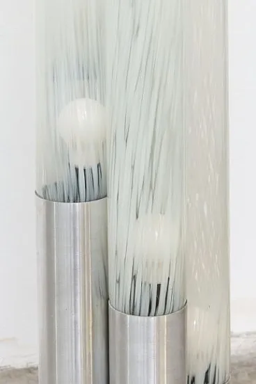 This model, nicknamed Gli Organi, is the most sought-after and scenographic version thanks to its structure with 5 cylindrical elements of different heights. The diffusers are made of precious blown Murano glass, characterized by a delicate nuanced milky finish that ensures soft, atmospheric light diffusion.