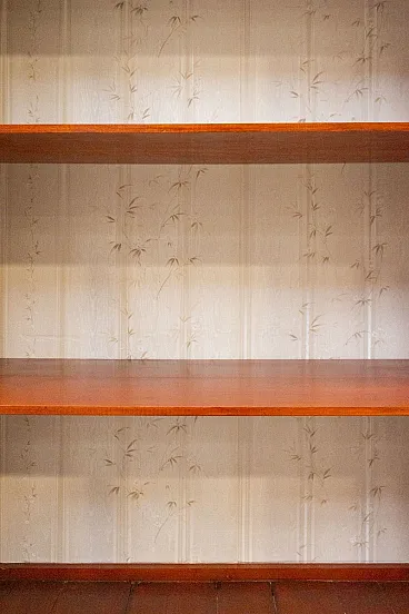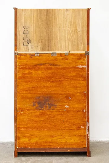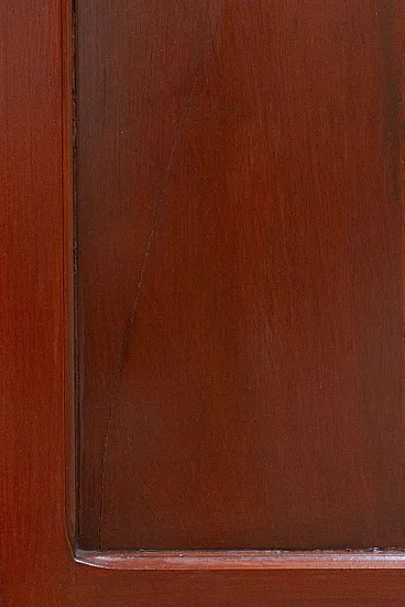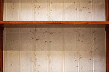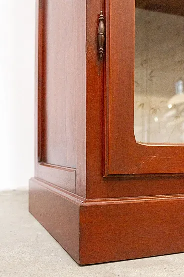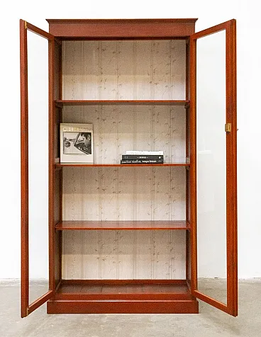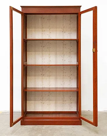Solid cherry wood display cabinet, handcrafted in the 1980s Simple and elegant lines, the doors are completely glass and the sides are decorated with squares. It features a lock with a working key. Internally, there are three shelves, which, together with the base, form four useful elements. The bottom of the bookcase is covered with decorative floral paper. The cabinet is overall solid and sturdy, with some signs of use. We cleaned and polished it. Dimensions: W (with frame) x D x H: 104 x 42 x 200 cm Doors W x H: 46 x 177 cm Distance between shelves: 43 cm, last 46 cm Weight: 40-80 kg