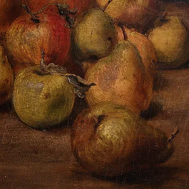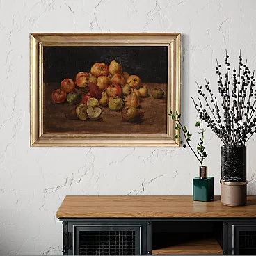 Elegant French painting from the 20th century. Oil painting on panel depicting a splendid still life with autumn fruits. The brushwork is soft and the color palette is dominated by warm tones, the reds and oranges of the apples, golden yellows and greens of the pears. The background is dark and neutral, acting as a theatrical backdrop that enhances the brightness of the fruit. The light comes from the side and models the volumes with delicate chiaroscuro transitions, bringing out the consistency of the skins and the natural imperfections of the fruits.