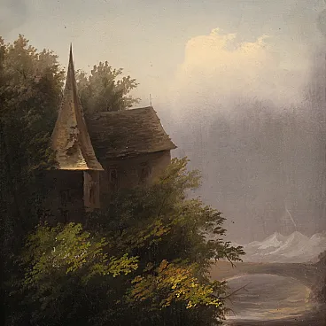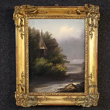 Splendid French painting from the mid-19th century. Oil work on panel depicting a wonderful river landscape, of notable pictorial quality. We see a watercourse flowing between rocks and vegetation, dominated by the presence of a picturesque rural building with a high sloping roof. The scene opens towards a bright sky crossed by light clouds, while delicate mountain ranges emerge in the distance, rendered with refined atmospheric perspective.