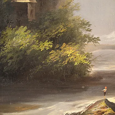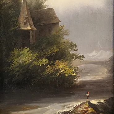 On the right, along the bank of the stream, we notice a small figure of a solitary fisherman, who gives a poetic and contemplative character to the scene. The composition, built with balance between shaded areas and bright openings, reveals a painting sensitive to the tradition of the European romantic landscape. The rendering of moving water and illuminated foliage is particularly effective, obtained through a lively and vibrant brushstroke.