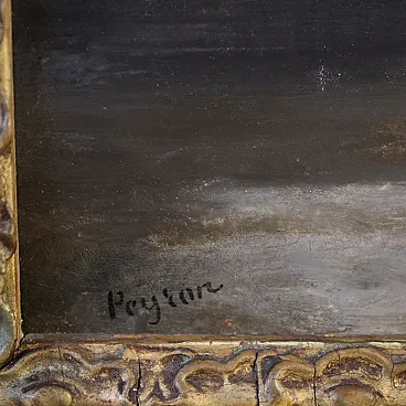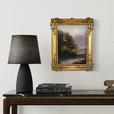 Painting signed Peyron on the bottom left, referable to the French painter Jacques Guillaume Achille Peyron, a talented landscape painter from Saint-Germain-en-Laye who participated in the Paris Salon between 1831 and 1844 (the work is not currently accompanied by an expertise, but it is possible to request it upon payment of the relevant additional costs). Ideal painting for refined, classic or contemporary environments, capable of bringing the poetry of the romantic landscape into the domestic environment. Spectacular contemporary frame in wood and gilded plaster, beautifully decorated, with some small defects and signs of aging (see photo). Overall, it is in a good state of conservation. Light painting H 35 x W 26.5 cm.