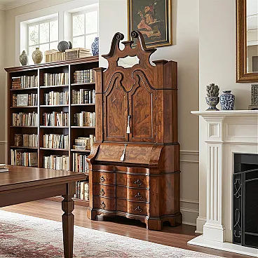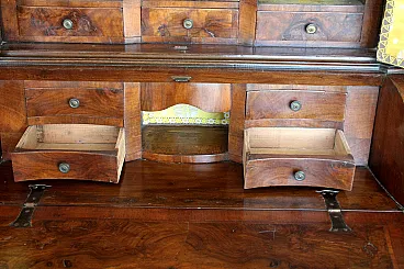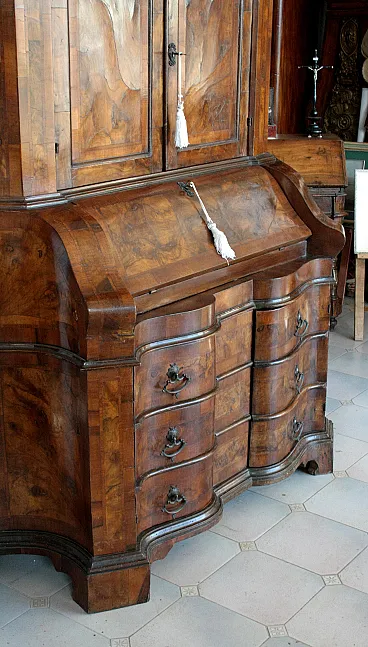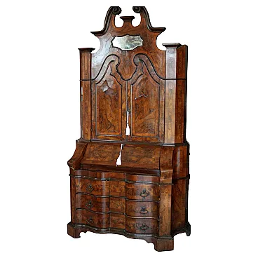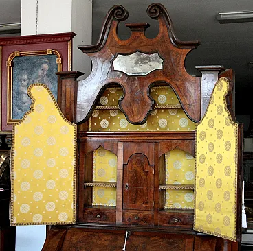 This original Lombard trumeau, dating from the 19th century and made of fine walnut and walnut burl, is a masterpiece of northern Italian craftsmanship. The wavy body has an elegant trapezoidal line, topped by a broken gable cyma, which gives a refined sense of balance. The top has two briar doors that enclose four shelves divided into compartments, as well as a ribbed door with three aligned drawers, ideal for carefully organizing small items. The lower part, characterized by a leaf spring facade and bordered by corner pilasters, offers three drawers flanked by a flap with a central door and a side compartment with a drawer pull underneath, perfect for storing documents or tools. Shelf feet give stability and lightness in the overall design. With imposing dimensions (140 cm width, 60 cm depth, 265 cm height), 155 cm upper body height, 110 cm lower body height, this piece of furniture combines functionality and classic style, becoming a distinctive element for fine rooms. Silk interiors from San Leucio, Southern Italy factory.