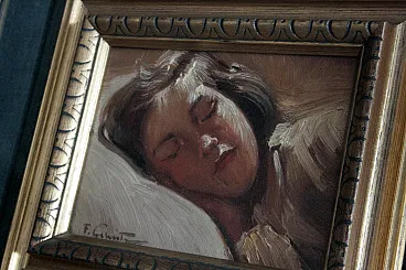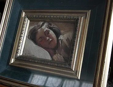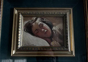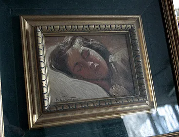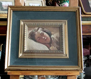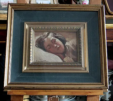 Painting By Francesco Galante, "Sleeping Child," a work that captures the essence of the early 20th century Neapolitan school. Technique Oil on plywood, executed with the characteristic mastery of the Apulian artist. Measure without frame, 20cm wide x 16cm high. Measurements with frame 39 cm high by 44 cm wide. Francesco Galante (Margherita di Savoia 1884-Naples 1972) is known for his sensitivity in depicting intimate subjects and scenes of everyday life, with particular attention to child portraits. This work represents a significant example of his artistic output, characterized by soft brushstrokes and a delicate color palette that evokes an atmosphere of serene innocence. Signed work