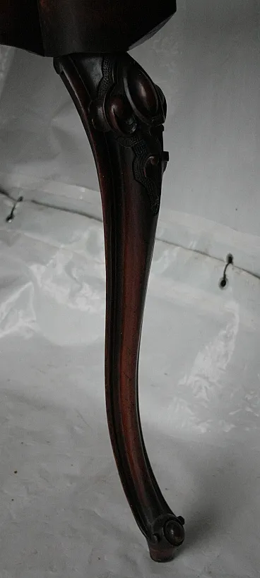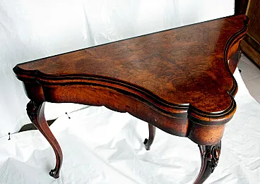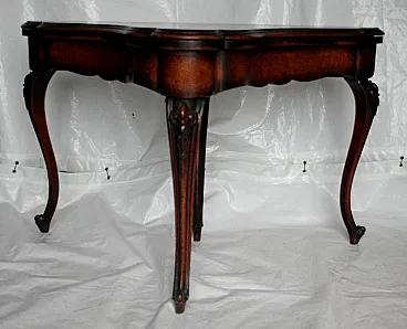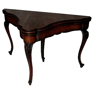 Console English gaming table late 18th century This fine game table of late 18th-century English manufacture represents a specimen of exceptional cabinet-making quality. The flip-top, made of fine flame mahogany with particularly pronounced grain, reveals a green baize-covered playing surface upon opening, framed by a meticulously crafted flame mahogany border. The frame is distinguished by an elegant, finely scalloped perimeter apron that harmoniously connects with the cabriole legs, which feature a sinuous curvature typical of the style of the period. The overall silhouette shows perfectly balanced proportions, evidence of the craftsmanship of the Georgian period. The dimensions of the cabinet, 123 cm wide by 60 cm deep and 76 cm high when closed, turn into 123 cm wide by 121 cm deep and 75 cm high when open, making it a versatile and functional element for representative environments. A genuine collector's item that combines historical value, aesthetic refinement and practicality of use.
