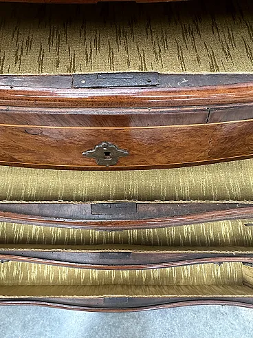 Elegant antique chest of drawers in Louis XV style and era, mid-18th century, made in Piedmont. Of particular construction, it is "wavy" both on the front and on the sides and this last particularity makes it not easy to find. There are four drawers, and not three like the posthumous ones, and they all have their original locks and their beautiful handles, including escutcheons, in cast bronze, with the classic Turin shape of that time. The inside of the drawers is lined with a beautiful gold-colored fabric and finished with trimmings. The structure of the dresser is in solid walnut with the back, the bottom and the inside of the drawers in larch. The upper support surface is veneered: with a frame, which surrounds the owl's beak edge, in walnut and a central part in thuja briar with a maple fillet that surrounds it. Same work as the surface for the panels of the four drawers where, on the sides, the fillet creates a pointed arch design. On the two uprights there are two tiles with the same design as the drawers. The state of conservation is excellent, healthy with a beautiful patina, the inside of the drawers has recently been lined with fabric. The structure is all original, including the interior and the lining, all with the original 18th century nailing.