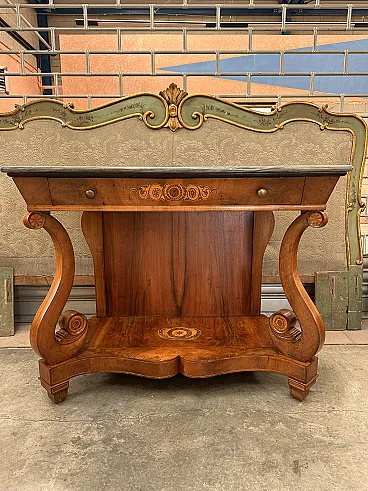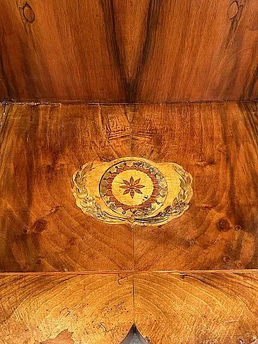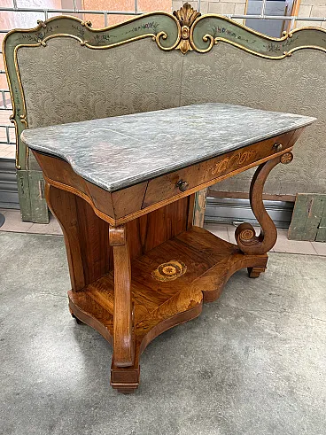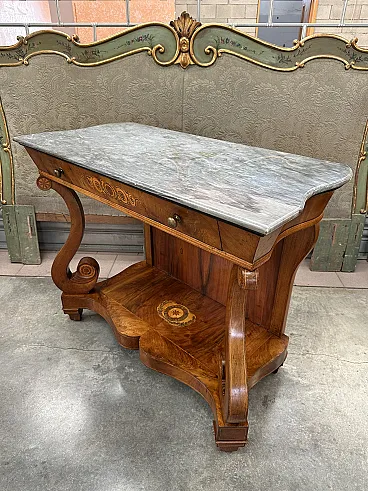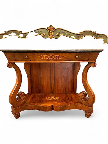 This very particular console is in fact moved on the sides, but with a "wave" that narrows inwards instead of widening as usual: with a facade width of 123cm. there is a rear width of only 110cm. The band underneath the marble is flared inwards, classic from the early 19th century, and has a retractable drawer with two bronze knobs and a beautiful maple floral inlay in the central part; the whole rests on an edge with a double fillet that connects it to the underlying part. The "back" in "open stain" walnut is surrounded by two uprights with double inlaid fillets. In the front part, two beautiful walnut pilasters with fillets and four inlaid rosettes connect it to the lower floor. The latter, 8cm high, is entirely veneered in walnut and threaded and has a very particular maple and bronze inlay in the central part with a rosette surrounded by two laurel branches. The console rests on four feet and an inverted truncated cone made of walnut with very elegant flexes. The state of conservation is excellent, it is healthy and has undergone very few interventions over the years. The numerous photos are authentic.