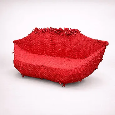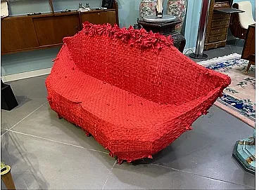 Model sofa “Pollock”, designed and made by Anacleto Spezzapan, characterized by a strong sculptural identity and a highly distinctive textile treatment. The structure has a soft, enveloping, almost organic line, completely covered in a red material fabric, rich in reliefs and irregularities. The surface appears deliberately “vibrant”, with applied textile elements that create a dynamic three-dimensional effect, evoking the free and instinctive gesture of informal painting. The compact and continuous volume eliminates the traditional distinction between structure and covering, transforming the sofa into a unitary, almost sculptural object. The intense color choice amplifies the stage presence, making it a central element in the space. More than a sofa, an expressive object: “Pollock” interprets the design as an artistic gesture, transforming the covering into a narrative surface. A distinctive piece, capable of defining space.