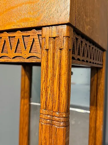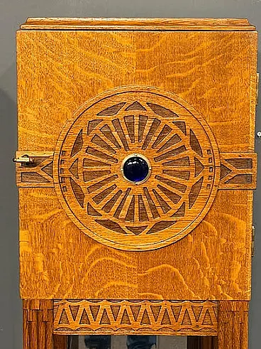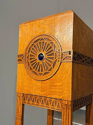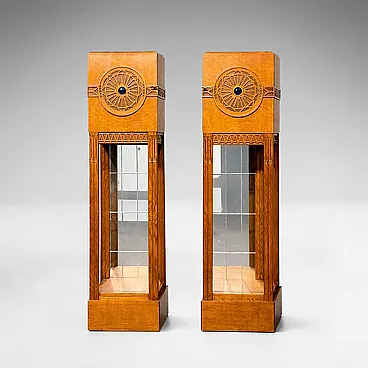 A refined pair of Liberty oak columns, characterised by a slender structure and rich carved decorative apparatus. The top is embellished with a stylized circular pattern enclosing a central blue glass insert, a distinctive element that captures light and gives depth to the composition.