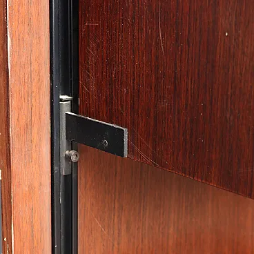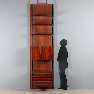 Wall bookcase that requires wall fixing, with boiserie panel and container elements with flap opening and container with drawers; in exotic wood veneer, with enamelled metal uprights and supports. Good condition.