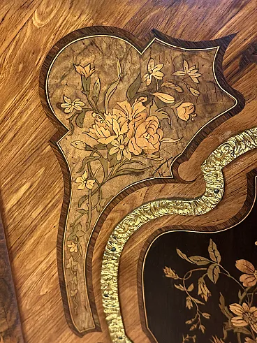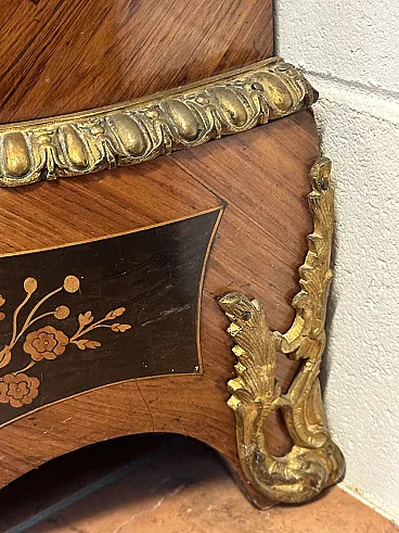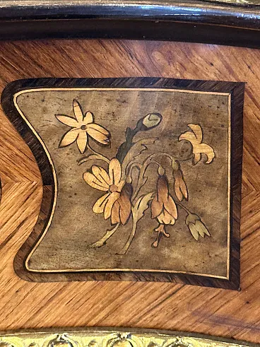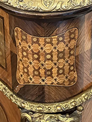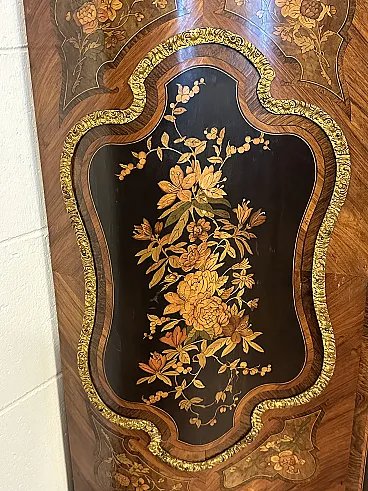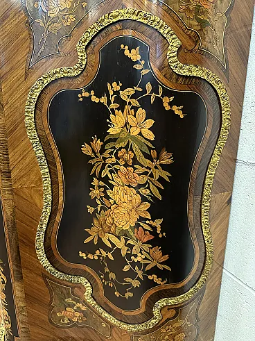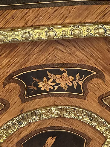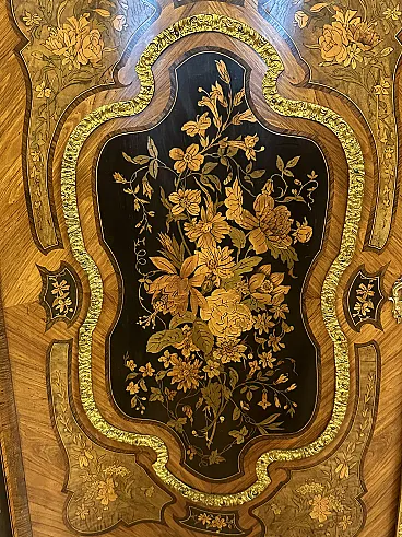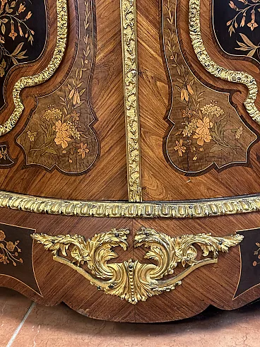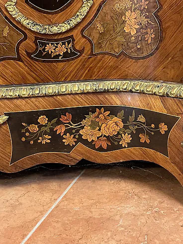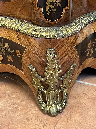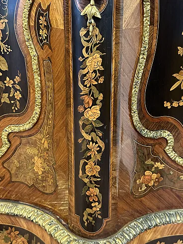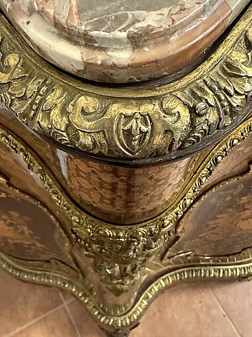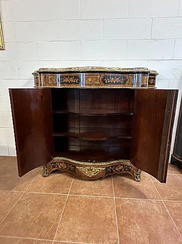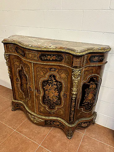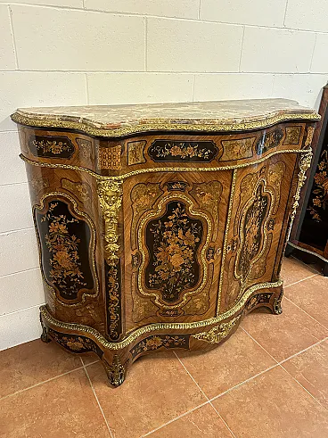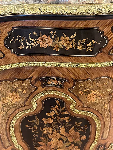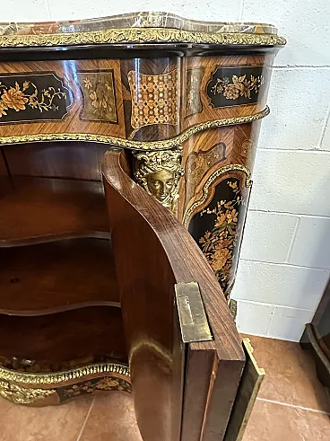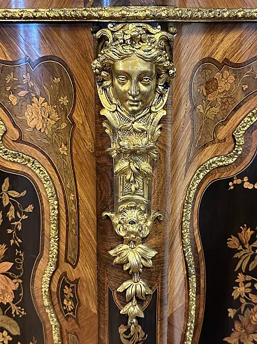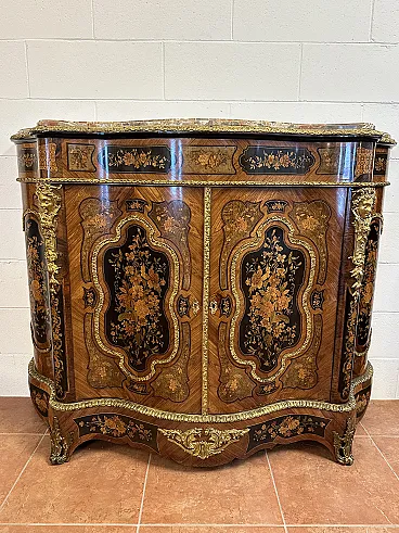 Rare sideboard or servant in Napoleon III style of French origin (Paris) and from the mid-19th century. Characterized by a wavy and rounded structure, it has rich floral marqueterie inlays and gilded bronze decorations. Made of precious wood essences, it is veneered in "herringbone" bois de rose with numerous rosettes (47 between small and large) all finely inlaid with floral triumphs (except the two at the top on the geometric uprights) and surrounded by a triple thread and many of them on a black ebonized background which enhances the polychromy of the different essences and is typical of the first Napoleon III; those on the four largest vertical panels are particularly rich, additionally surrounded by chiseled gilded bronze profiles that follow the ovaloid shape. Embellished with other applications in chiseled gilded bronze that follow the curved lines of the furniture, it has a large floral bronze in the center of the low crossbar and two large bronzes at the top on the two uprights depicting female faces surrounded by floral motifs, in addition to the four bronzes on the four feet. The Servante is surmounted by a shaped marble top, typically recessed to follow the mixed-line line of the furniture.