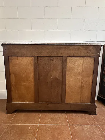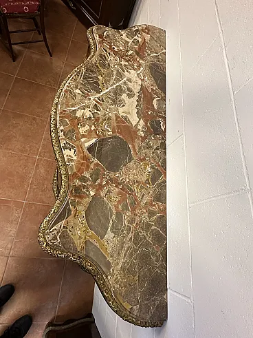 The marble present in the shaped top of the furniture is the precious Macchiavecchia Marble, a polychrome limestone rock known for its rich color palette which includes shades of grey, brown, red and ocher on a light base and is very popular in luxury furniture and antiques.