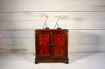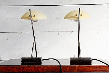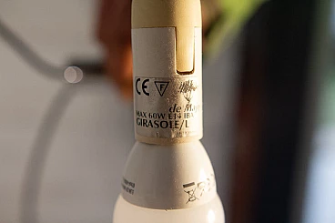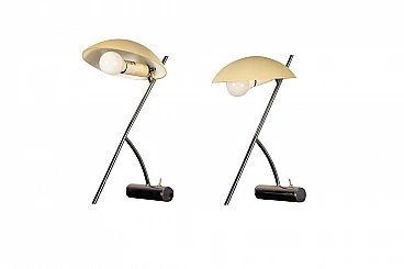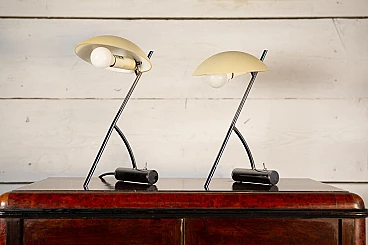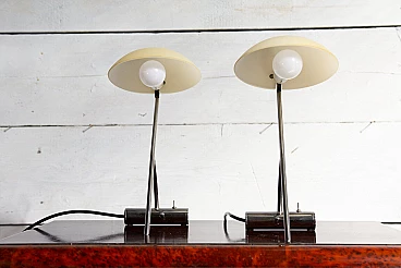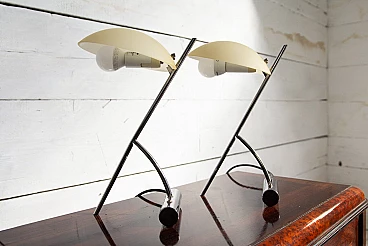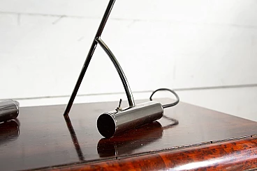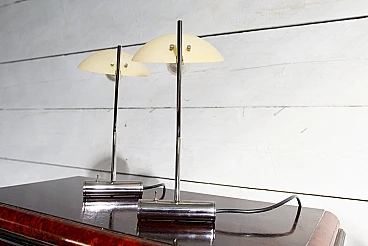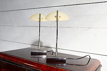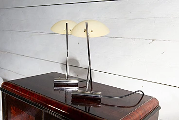 The historic murano glass lamp company has produced this small and elegant table lamp in chrome metal with a delicate satin murano glass diffuser. The small size makes it perfect for direct light on a piece of furniture or bedside tables. The pair of lamps is in excellent used condition. It comes with a replacement glass.