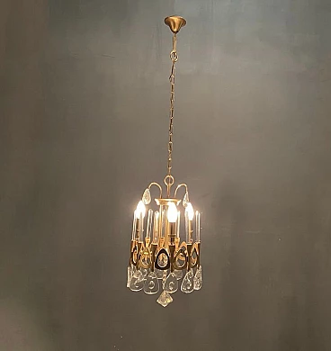 Chandelier attributed to Gaetano Sciolari in lead crystal and gold colored metal. Height without chain and ceiling canopy: 42 cm. 3 lights, wiring compatible with UK and Europe.