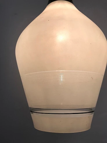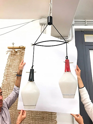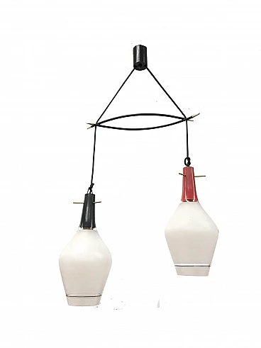 Elegante lampada da soffitto in stile Stilnovo, a due pendenti a cilindro sagomato in vetro colorato rispettivamente nero e rosso, e arricchito da filettature. Piccoli segni di usura.